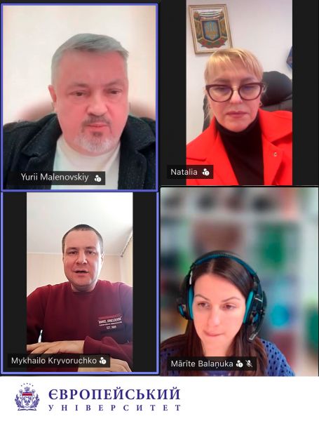 Європейський університет на зустрічі представляли директор міжнародного освітньо-підготовчого центру Юрій Маленовський та директорка Черкаської філії Університету Наталія Польова. Латвійську сторону представляли M?r?te Bala?uka – керівниця міжнародних зв’язків, керівниця групи міжнародних проєктів, а також Agita Šmiti?a – викладачка управління проєктами у креативних індустріях та Agita Livina – співкерівниця Докторської школи.