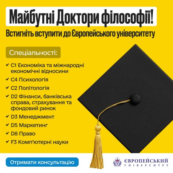 Шановні вступники!Європейський університет оголошує прийом документів до аспірантури (PhD). Подання заяв здійснюється через електронний кабінет вступника: vstup.edbo.gov.ua. Реєстрація в електронному...